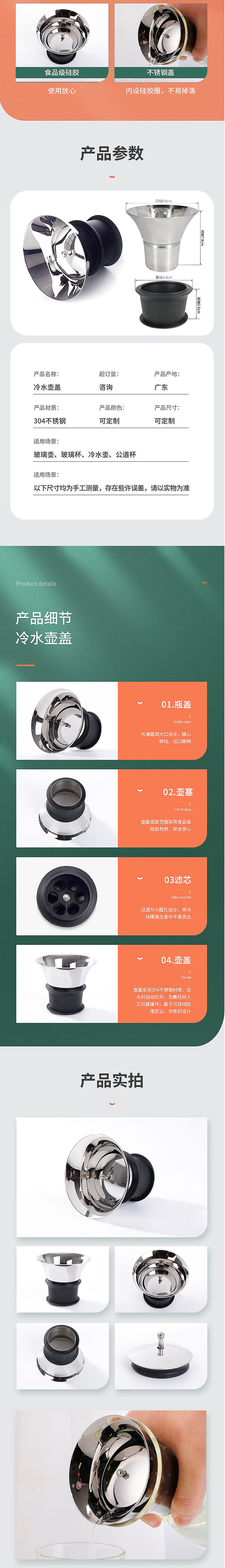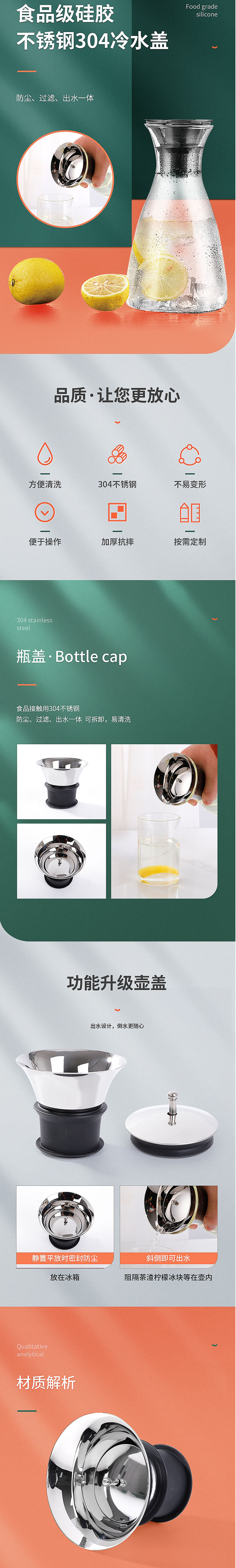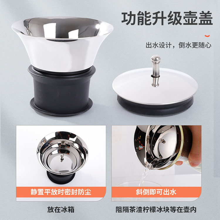 食品接觸用304不銹鋼。防塵、過濾、出水一體可拆卸,易清洗。出水設計,倒水更隨心。靜置平放時密封防塵,斜倒即可出水。放在冰箱,阻隔茶渣檸檬冰塊等在壺內(nèi)。硅膠,不銹鋼蓋,內(nèi)設硅膠圈,不易掉落。