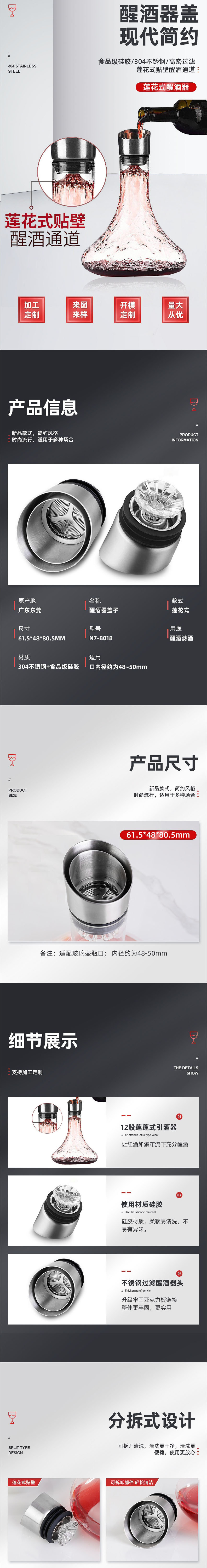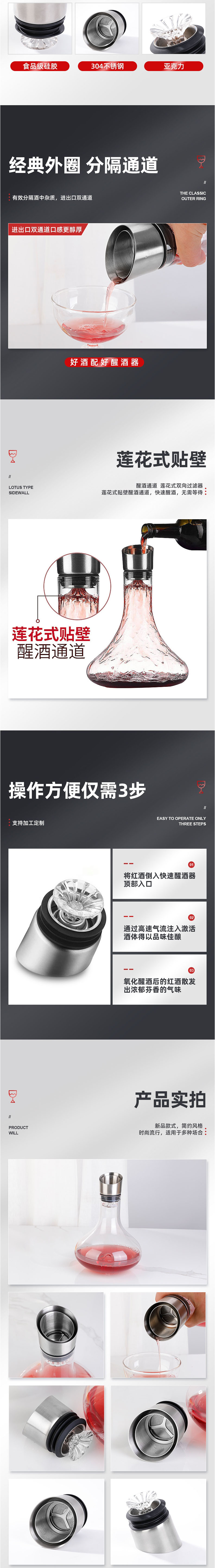 蓮花式貼壁醒酒通道:新品款式,簡約風(fēng)格,時(shí)尚流行,適用于多種場合。12股蓮蓬式引酒器,讓紅酒如瀑布流下充分醒酒,使用材質(zhì)硅膠。硅膠材質(zhì),柔軟易清洗,不易有異味。不銹鋼過濾醒酒器頭,升級牢固亞克力板鏈接整體更牢固,更實(shí)用。分拆式設(shè)計(jì),可拆開清洗,清洗更干凈,清洗更便捷,使用更放心。經(jīng)典外圈分隔通道,分隔酒中雜質(zhì),進(jìn)出口雙通道。蓮花式貼壁,醒酒通道蓮花式雙向過濾器,蓮花式貼壁醒酒通道,快速醒酒,無需等待。